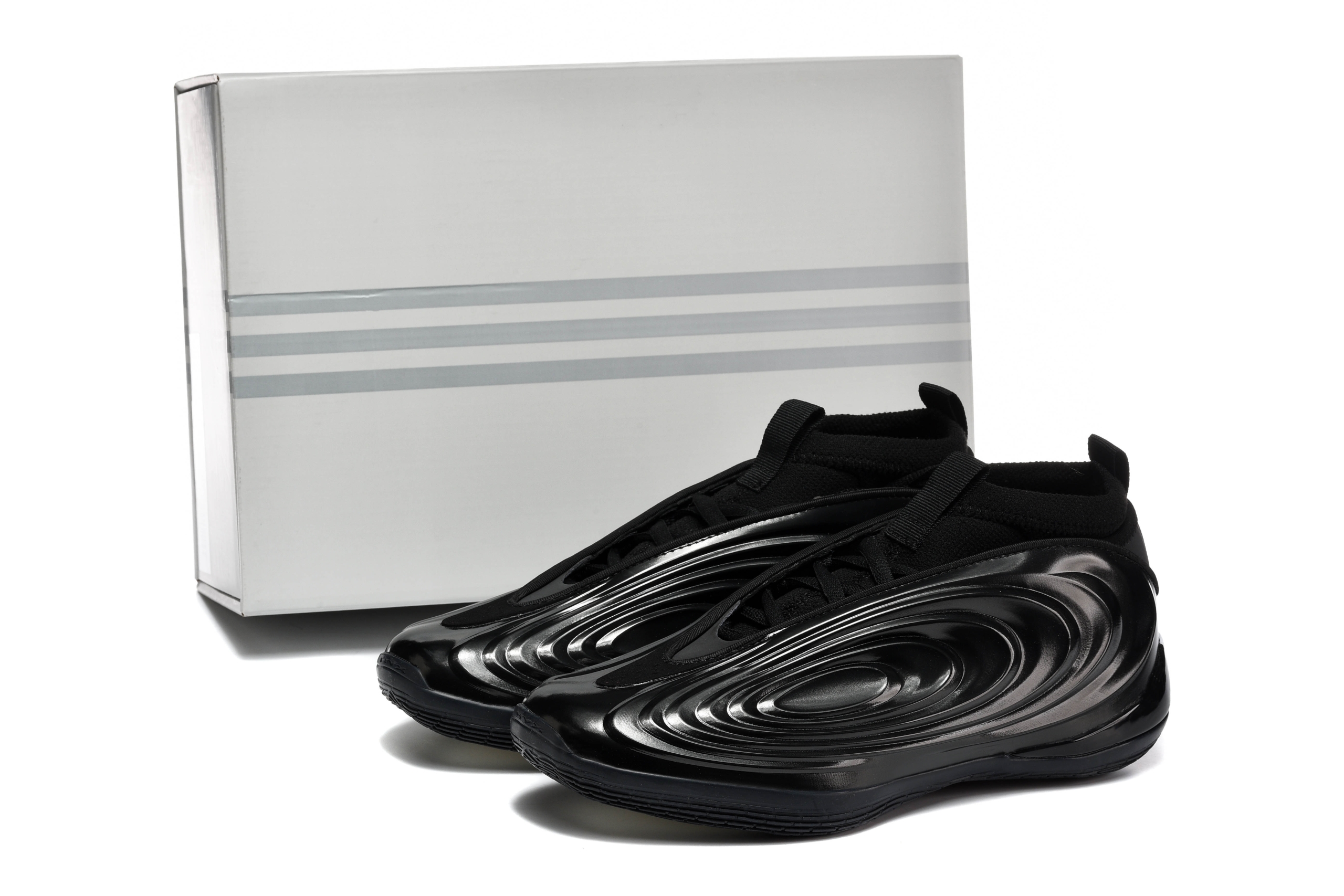 Вдохновленные мощью и агрессивным дизайном маслкаров Hellcat, эти кроссовки выполнены в глянцевом черном цвете, имитирующем полированный кузов автомобиля. Красные элементы, напоминающие круглые задние фонари, проглядывают через небольшие вентиляционные отверстия в носочной части и на основных зонах подметки. Белые три полоски на пятке добавляют контраста.